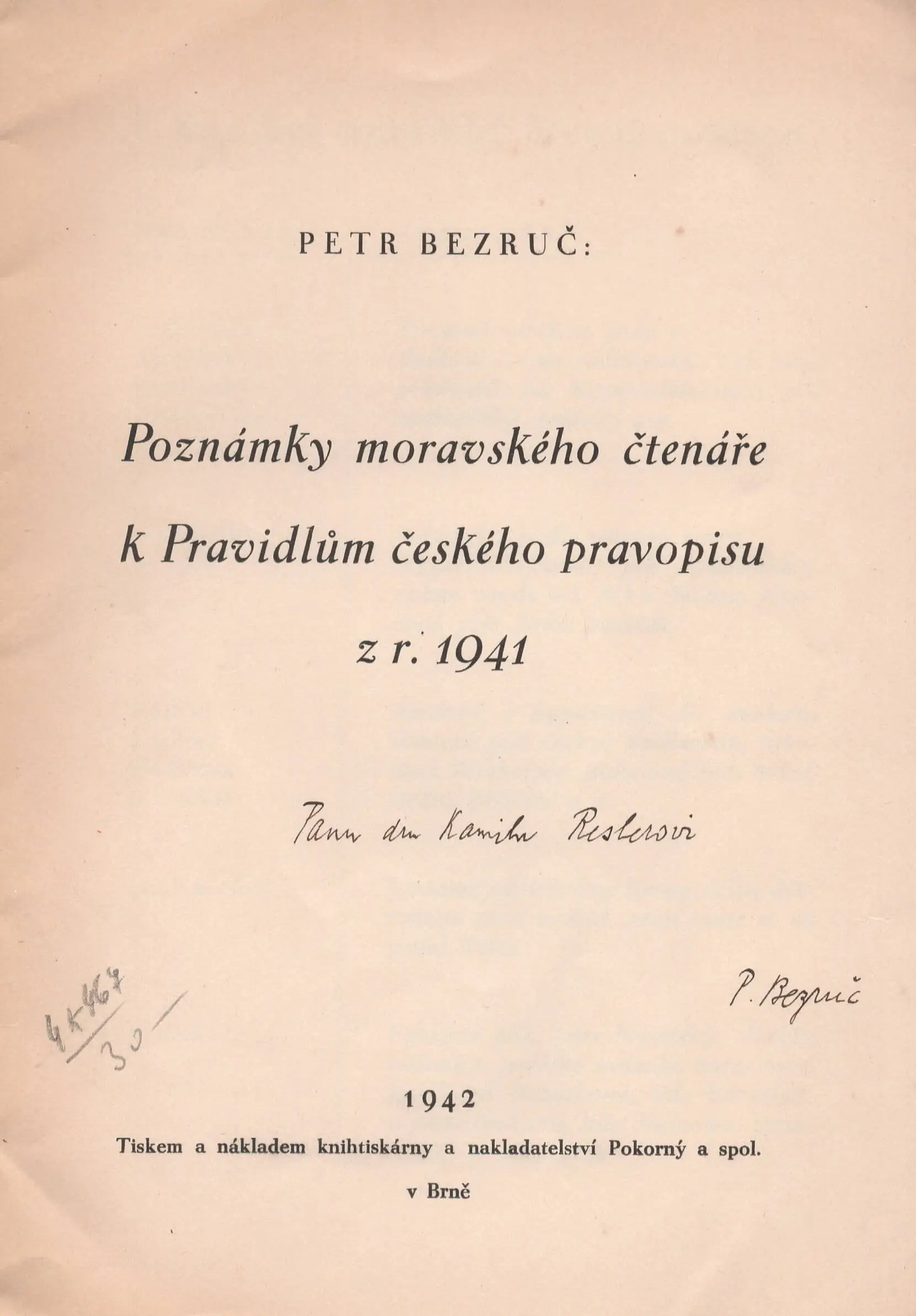 Věnování podepsané Petrem Bezručem panu Kamilu Reslerovi.